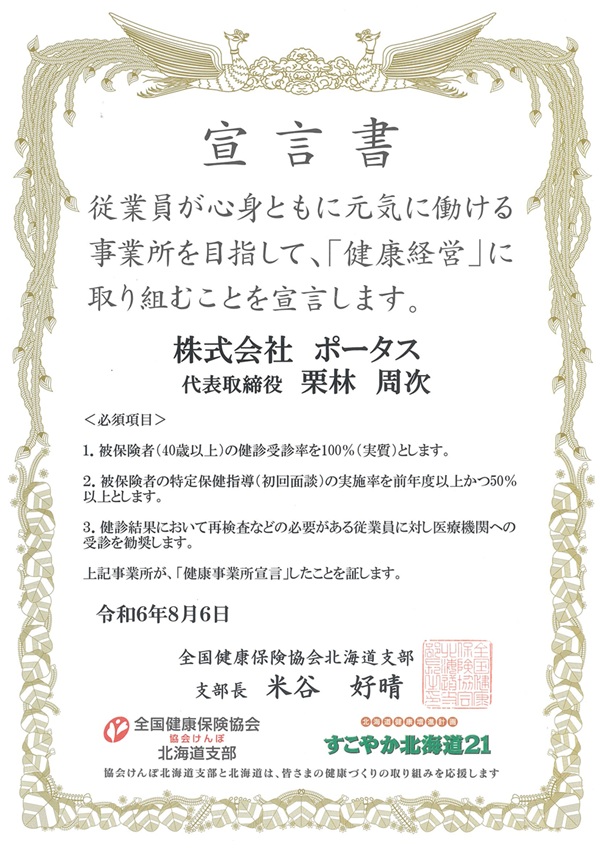 健康事業所宣言を行いました 2024.08.19 株式会社ポータスは、全国健康保険協会 北海道支部が推進する「健康事業所宣言」企業の認定を受けました。 従業員が心身ともに元気に働ける事業所を目指して、従業員の健康づくりに向けて取り組みを進めて参ります。 お知らせ一覧へ